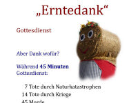 Zudem stellt sich die Frage, ob unter der gewagten Annahme der Existenz eines Gottes dieser überhaupt in irgendeiner Form Dank verdient hätte: Während einer üblicherweise halbstündigen Mahlzeit im Kindergarten sterben weltweit über 300 Kinder einen qualvollen Hungertod. Warum sollten die Kinder einem Gott, der so etwas zuläßt, für irgendetwas zu danken haben? Alles, was dieser Gott verdient hätte, so er denn existierte, wäre eine Anklage wegen unterlassener Hilfeleistung und fahrlässiger Tötung, aber ganz gewiss kein Dank und noch weniger Respekt.
